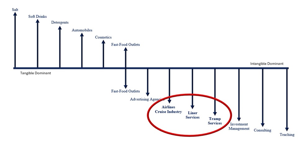 | Services are considered intangible because they cannot be physically experienced through senses such as sight, touch, or taste. Customers purchase transport solutions without a physical product to hold. This characteristic makes it difficult for customers to evaluate the quality of services beforehand. For instance, in container shipping, the value lies in cargo delivery to its destination, an outcome that is not directly observable until completion. However, considering the tangibility spectrum developed by Shostack (1977), shipping services vary in tangibility depending on the sector and service type. Figure 2 illustrates the services tangibility spectrum, adapted from Shostack (1977) and contextualised for shipping. In this contextualisation, and for ease of analysis, three shipping markets are considered, namely the cruise, the liner and the tramp shipping markets. |
