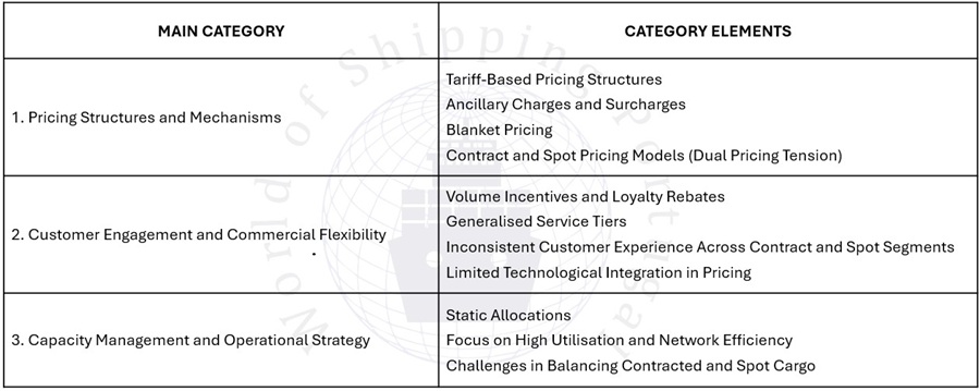 | Still, to better understand the structural inertia that continues to shape pricing behaviours in this evolving environment (Wang and Ding, 2021; Raza et al., 2023), it is essential to examine the foundational logic of traditional revenue models. These legacy practices in container shipping can be grouped into three overarching thematic categories, namely 1) pricing structures and mechanisms, 2) customer engagement and commercial flexibility and 3) capacity management and operational strategy, each representing a pillar of historical industry logic. Pricing structures and mechanisms encompass the formulation of base freight rates and supplementary charges, with a strong emphasis on standardisation, administrative ease, and cost recovery, often at the expense of pricing flexibility and responsiveness to demand variability. Customer engagement and commercial flexibility include pricing and service strategies for managing customer relationships, such as volume incentives and service tiers. It also reveals how limited technological integration has constrained the ability to segment customers or implement dynamic, value-based offerings. Capacity management and operational strategy reflect how vessel space has historically been allocated and managed, revealing a systemic reliance on volume-driven utilisation metrics, often without regard to profitability or demand volatility. |