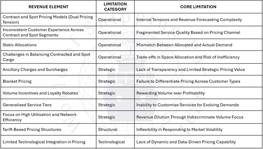 | The limitations of traditional revenue practices in container shipping can be broadly categorised into four overarching domains: structural, strategic, operational, and technological. This categorisation is not arbitrary but rather grounded in the distinct nature of each revenue element and its specific mode of influence on commercial performance. Each category encapsulates a particular dimension of constraint that, collectively, shapes the overall effectiveness and adaptability of revenue generation models within the sector (see Table 2). Each identified limitation is examined in the following paragraphs, offering a detailed analysis of how legacy practices in container shipping are constraining revenue performance and what this implies for the industry’s future competitiveness. |